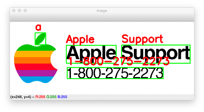 $ python localize_text_tesseract.py --image apple_support.png --min-conf 50 Confidence: 96 Text: Apple Confidence: 96 Text: Support Confidence: 96 Text: 1-800-275-2273