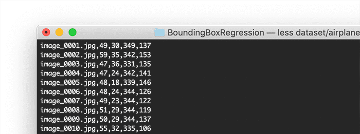 Note: There’s no need to download the full dataset from CALTECH-101’s website. I’ve included the subset of airplane images, including a CSV file of the bounding boxes, in the “Downloads” section associated with this tutorial.